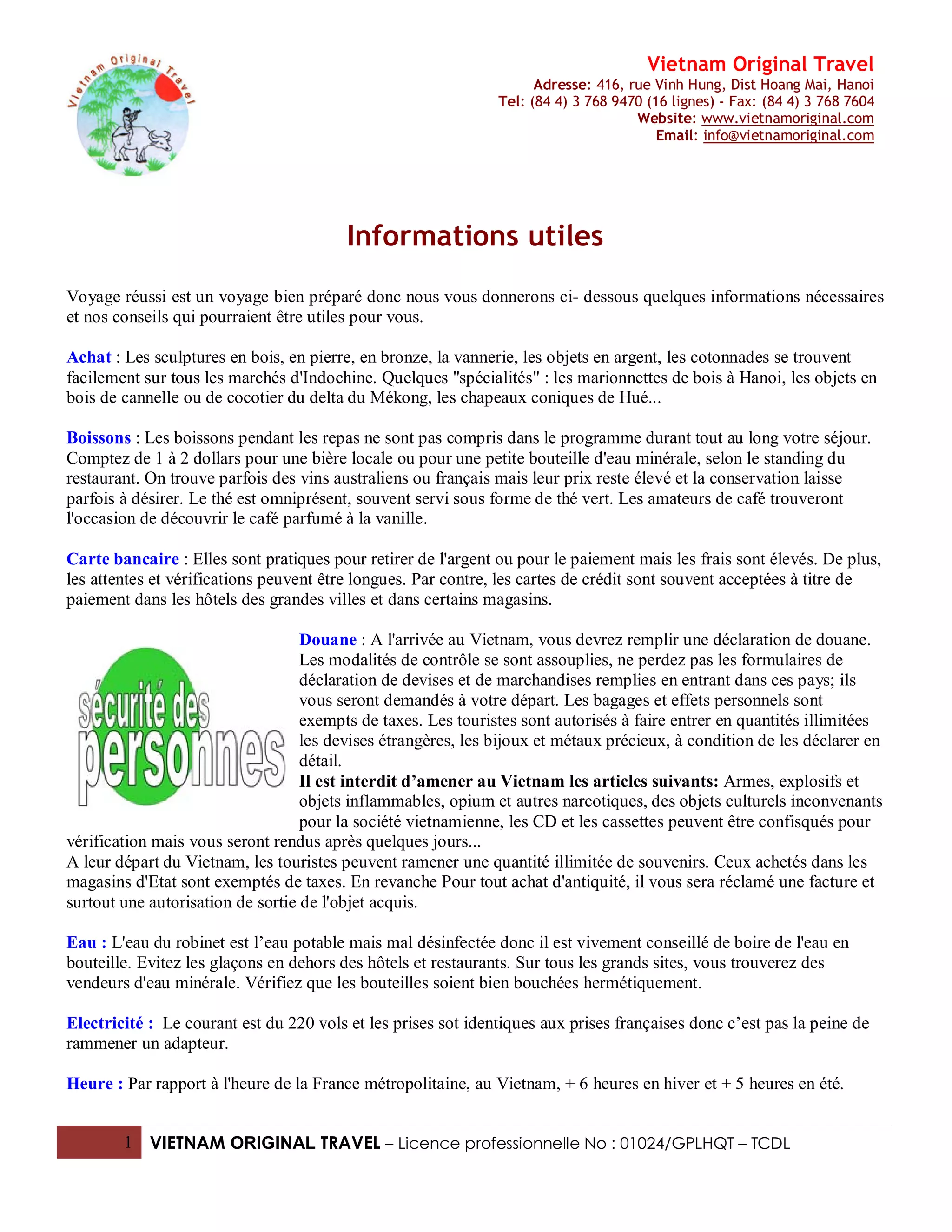 Le document fournit des informations essentielles pour planifier un voyage au Vietnam, incluant des détails sur les achats, la nourriture et les boissons, ainsi que des conseils sur la douane et la sécurité. Il décrit les moyens de transport disponibles, les options bancaires, et met en avant les destinations touristiques, le tout guidé par l'agence Vietnam Original Travel. Les contacts, adresses et modalités pratiques pour des séjours réussis y sont également mentionnés.
