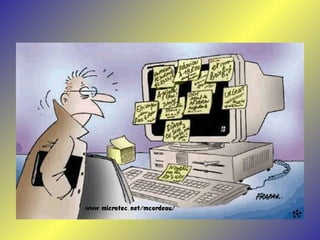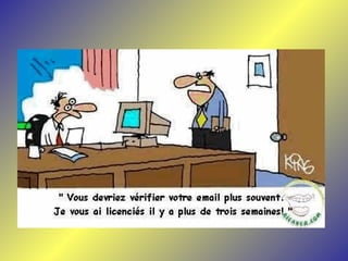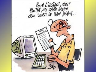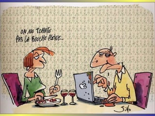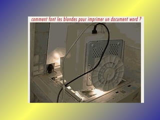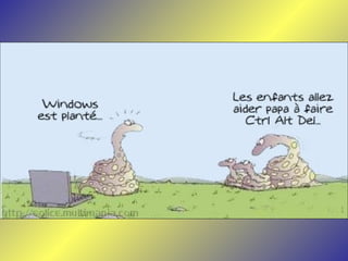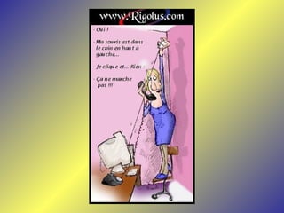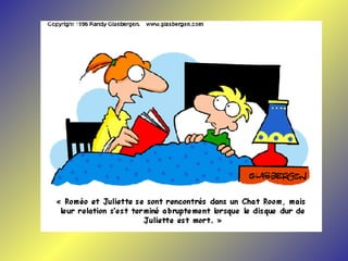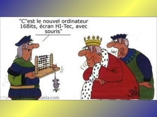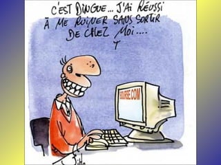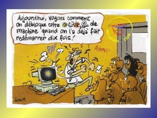 Le document présente une série de dialogues humoristiques sur les défis et les incompréhensions liés à l'informatique. Il évoque des situations où des personnages tentent d'utiliser la technologie moderne de manière complexe et parfois absurde. Des thèmes tels que l'amour en ligne et la communication après la perte d'un être cher sont également abordés.