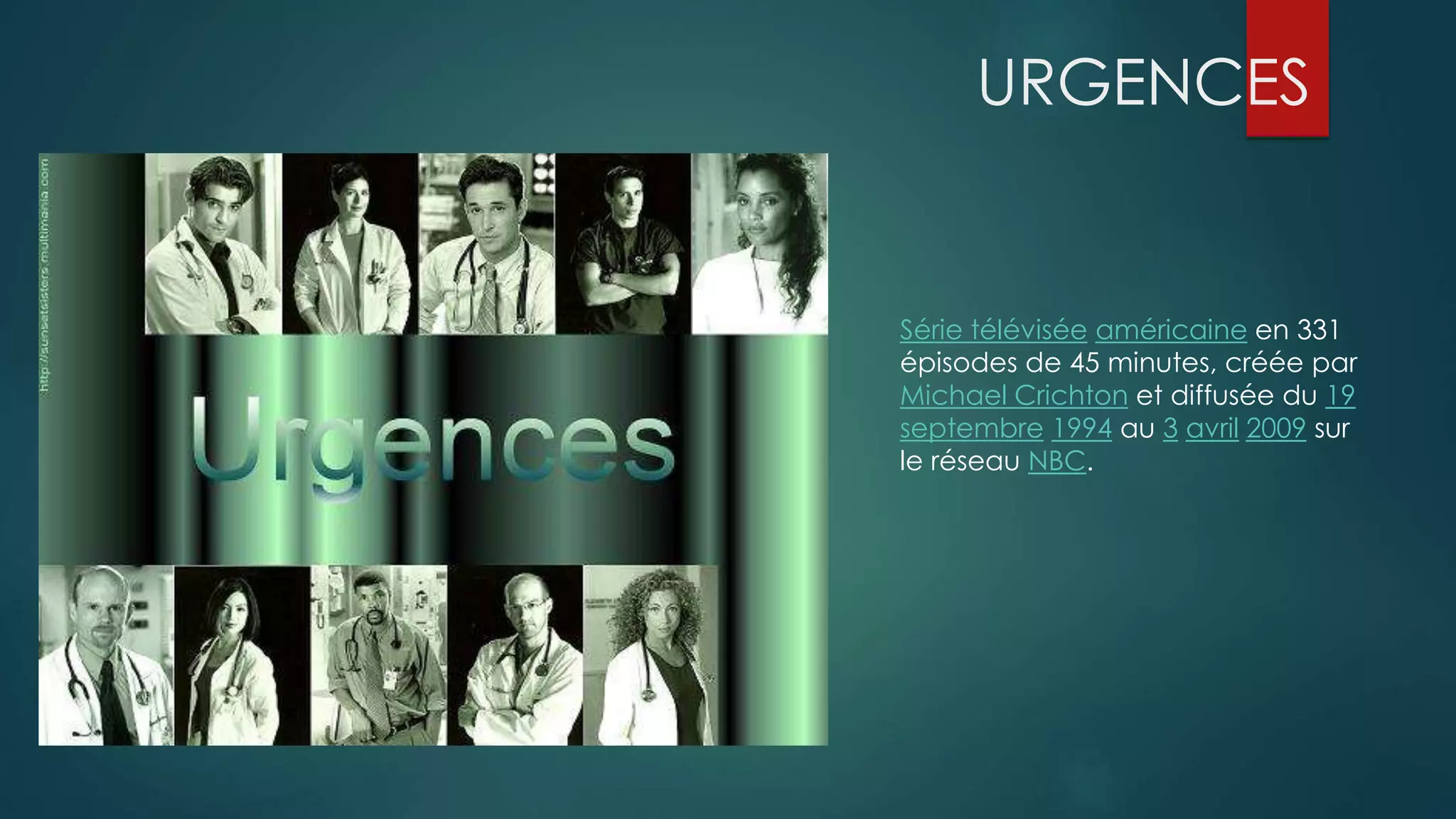 Le document présente plusieurs séries télévisées américaines liées au milieu hospitalier, telles qu'Urgences et Grey's Anatomy, abordant des thèmes sociaux contemporains. Il mentionne également Red Band Society, qui transpose les préoccupations adolescentes sur la maladie et la mort. Ces séries explorent des sujets variés tels que la séropositivité, l'homoparentalité, et les défis de la maturité face à la souffrance.