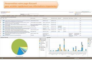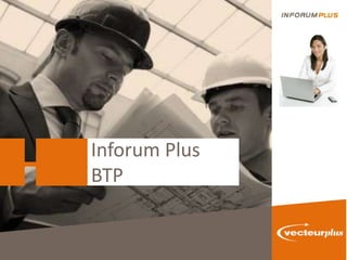 Inforum Plus BTP permet de personnaliser la page d'accueil pour un accès rapide aux informations essentielles et aux offres. Il propose des outils de suivi de projet, la création de fichiers de sociétés, et des tableaux de bord pour piloter l'activité commerciale. Des fonctionnalités supplémentaires incluent l'analyse de parts de marché et un espace collaboratif pour partager des documents.
