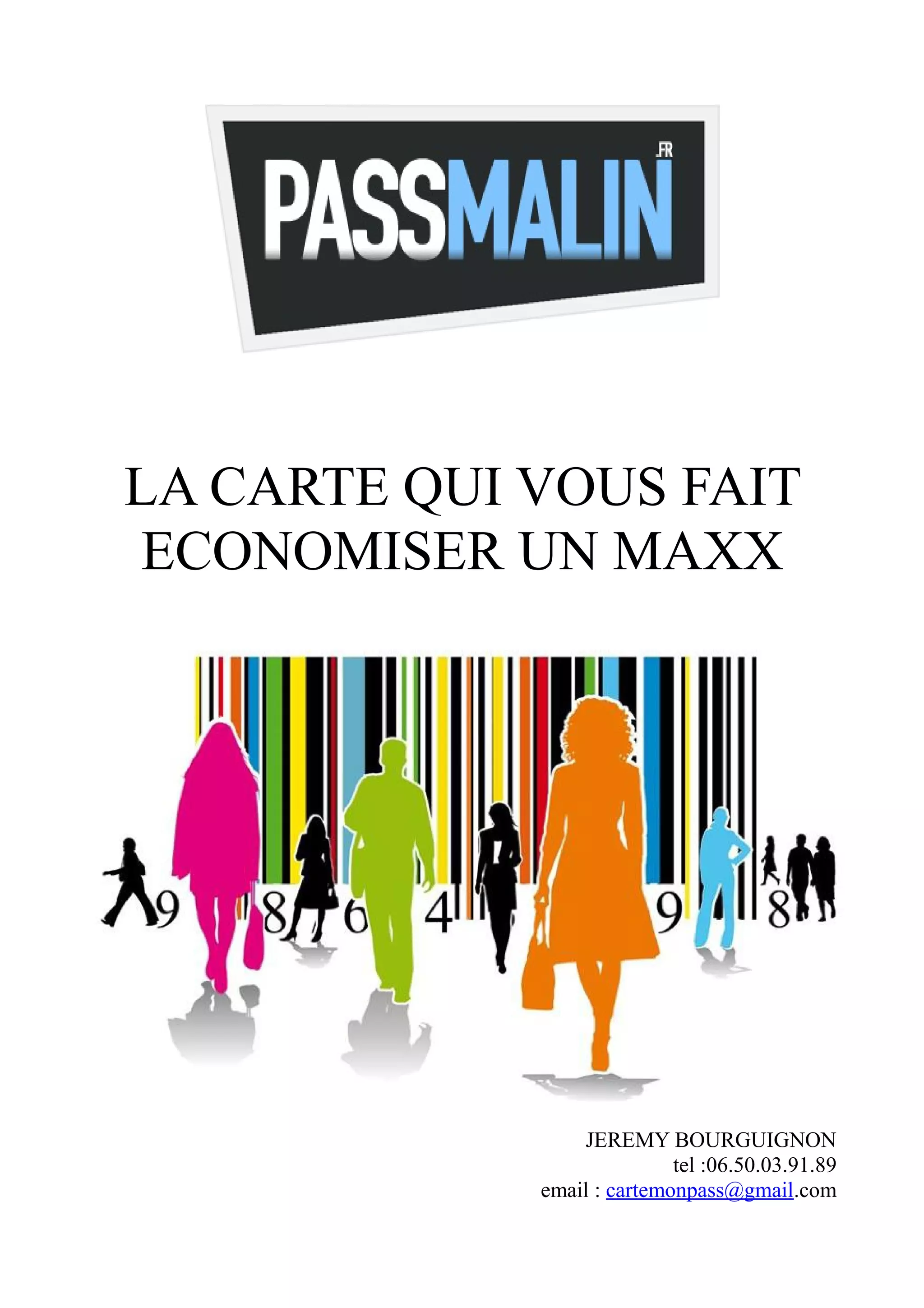 Le document présente la carte Passmalin, offrant des réductions sur divers services et produits à Nîmes, valable de septembre 2012 à septembre 2013. La carte coûte 10€/an et permet d'accéder à des remises de 10% à 50% chez de nombreux partenaires dans des domaines variés comme la restauration, le bien-être et les loisirs. Les clients peuvent s'inscrire en ligne pour obtenir la carte et consulter la liste des partenaires et réductions via le site Internet.