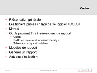 Le document présente FLIR Tools+, un logiciel intégré à Microsoft Word pour la création de rapports d'analyse des images infrarouges. Il décrit les fonctionnalités du logiciel, le support de divers fichiers, ainsi que les outils de mesure disponibles pour personnaliser et automatiser le processus de rapport. En outre, il souligne l'importance des modèles et des propriétés avancées pour optimiser la productivité lors de la création de rapports.
