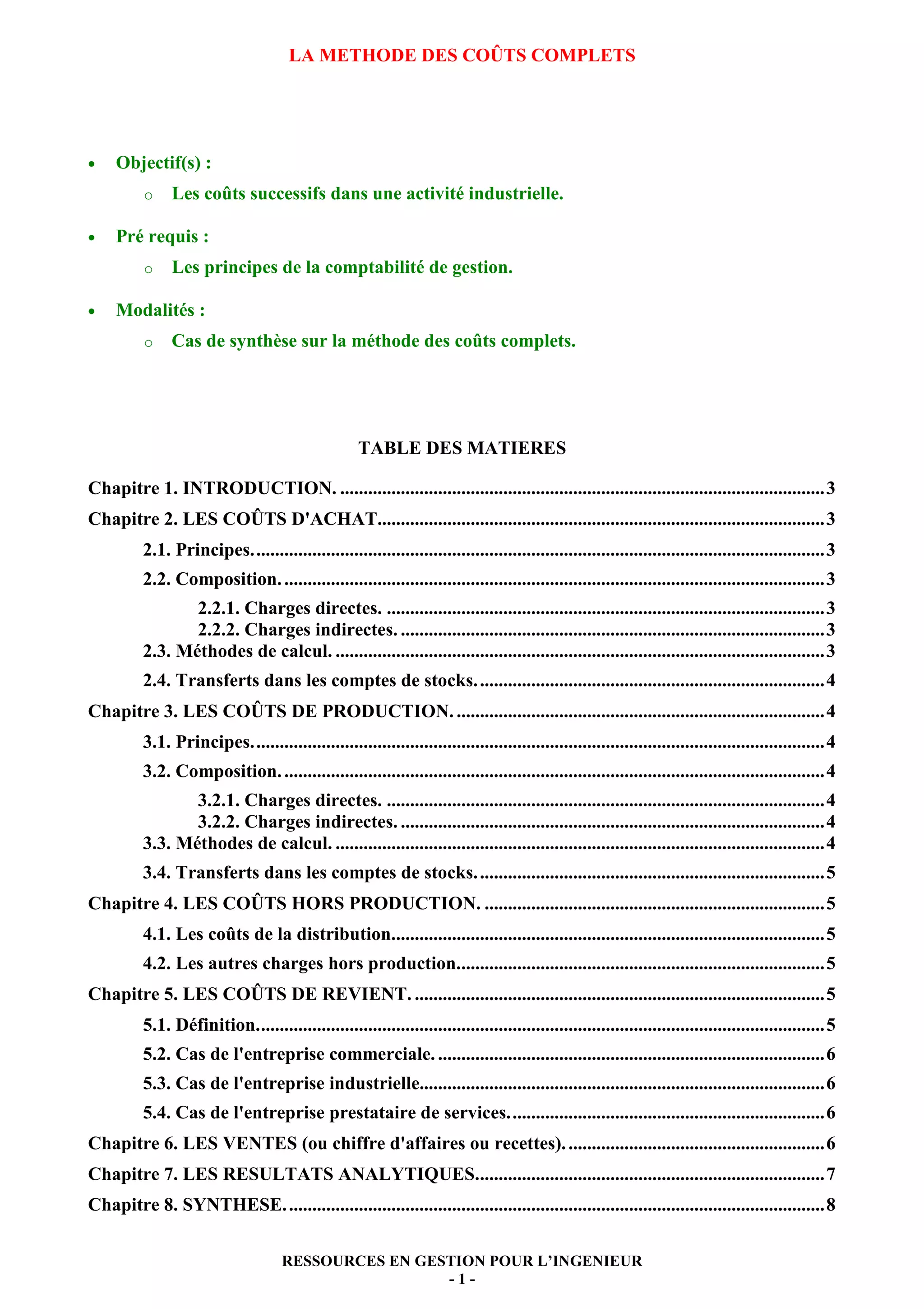 Le document présente la méthode des coûts complets, détaillant l'évaluation des charges à chaque étape du processus de production et de distribution des biens et services. Il aborde les coûts d'achat, de production, hors production et de revient, ainsi que les méthodes de calcul associées. Des cas d'étude et des exercices pratiques sont fournis pour illustrer l'application des concepts de gestion des coûts.