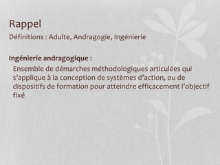 Le document traite de l'ingénierie andragogique, une méthodologie pour concevoir des dispositifs de formation adaptés aux adultes, en prenant en compte leurs besoins spécifiques et expériences. Il aborde les étapes clés du processus de formation, incluant l'analyse des besoins, la conception, la réalisation et l'évaluation des formations. Enfin, il souligne l'importance de personnaliser les stratégies de formation pour garantir une efficacité pédagogique.