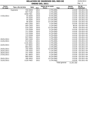 Le document présente un relevé des revenus pour le mois de janvier 2011, détaillant les paiements effectués avec des montants et des dates spécifiques. Il inclut également des informations sur les départements, les types de reçus, et les identifiants des demandes. Un suivi des paiements de février 2011 est également mentionné avec des détails similaires.