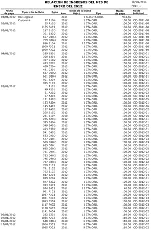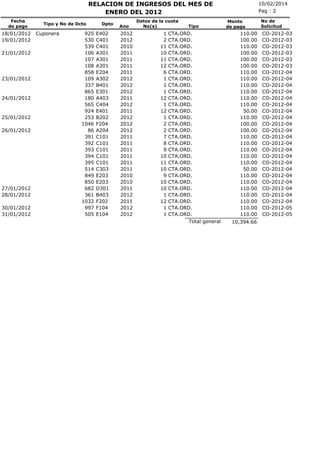 Le document présente un rapport détaillé des revenus pour le mois de janvier et février 2012, y compris les dates de paiement et les montants associés. Chaque entrée inclut des informations sur les types de coupons, les départements concernés et les demandes de remboursement. Au total, les montants de paiement répertoriés s'élèvent à plusieurs milliers, avec des détails spécifiques sur les demandes et les types de comptes associés.