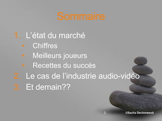Le document traite de l'évolution du e-commerce, mettant en lumière que 85% des internautes ont déjà effectué un achat en ligne, avec des prévisions de croissance continue du marché. Il souligne l'importance des commentaires et des avis clients, notant qu'ils influencent significativement les décisions d'achat et augmentent le taux de conversion. Finalement, il évoque l'essor des médias sociaux et les nouvelles opportunités dans l'industrie musicale et vidéo en ligne.