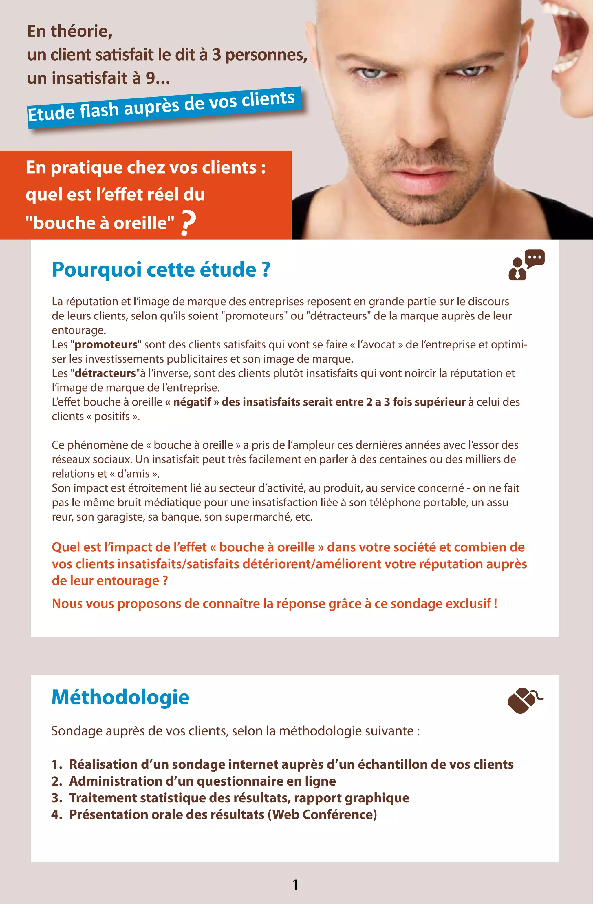 Cette étude analyse l'impact du bouche à oreille sur la réputation des entreprises, en distinguant les promoteurs et détracteurs parmi leurs clients. Les clients insatisfaits ont un effet néfaste jusqu'à trois fois plus fort que les clients satisfaits, amplifié par les réseaux sociaux. Un sondage est proposé pour évaluer cet impact au sein de chaque entreprise, avec des résultats présentés graphiquement et en web conférence.