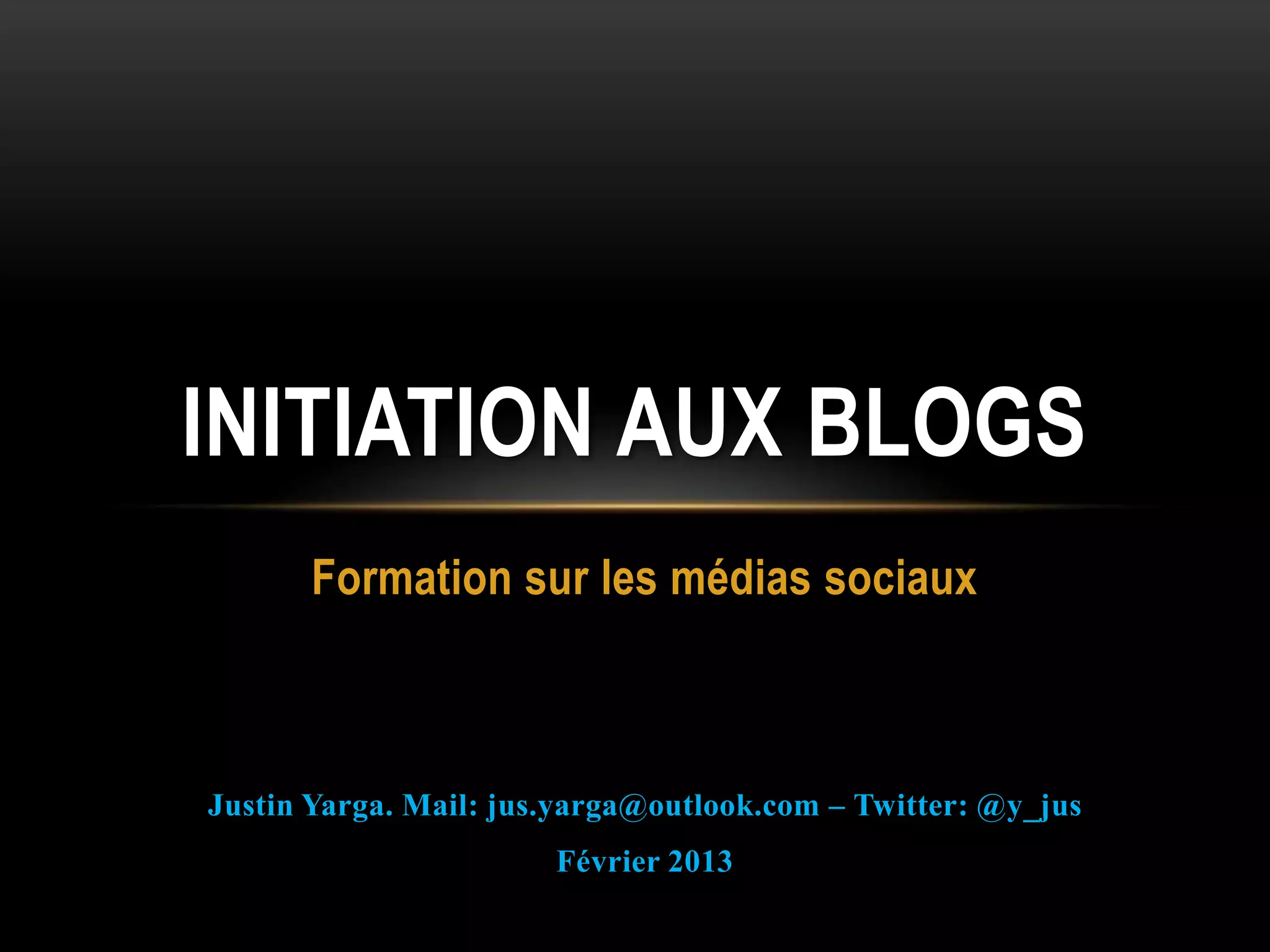 Ce document introduit les médias sociaux et les blogs comme outils de communication et d'expression personnelle. Il décrit les caractéristiques d'un blog, son utilité pour la liberté d'expression et son rôle pour les activistes. Des conseils pratiques sur la création de blogs, la visibilité et le référencement sont également fournis.
