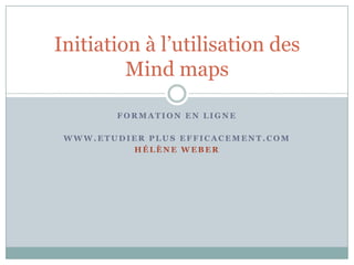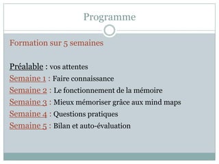 Ce document présente une formation en ligne de cinq semaines sur l'utilisation des mind maps, animée par Hélène Weber. Chaque semaine aborde des thèmes différents tels que le fonctionnement de la mémoire, la création de mind maps, et des exercices pratiques pour améliorer la mémorisation. La formation se termine par une auto-évaluation et un bilan des compétences acquises.