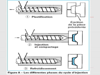 La fabrication de pièces en thermoplastiques par injection nécessite une presse à injecter, comprenant plusieurs éléments clés tels que le moule, le cylindre chauffant, et le groupe d'injection. La presse s'articule autour de différentes zones, notamment l'alimentation, la compression et la plastification. Le fonctionnement du clapet permet la gestion de l'ouverture et de la fermeture du moule.
