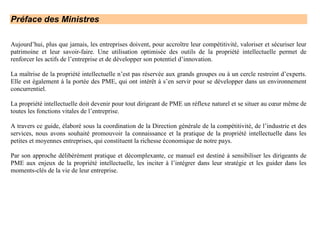 Le document souligne l'importance de la propriété intellectuelle (PI) pour les PME, en tant qu'outil essentiel pour sécuriser leur savoir-faire et stimuler l'innovation. Il propose un guide pratique destiné aux dirigeants de PME pour les aider à intégrer la PI dans leur stratégie d’entreprise, notamment en expliquant ses enjeux et en fournissant des conseils adaptés. Les chapitres abordent des thèmes variés, allant de la protection du savoir-faire aux coopérations avec des partenaires, en insistant sur l'accessibilité de la PI pour toutes les tailles d'entreprises.
