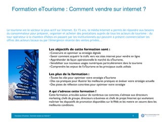 La formation 'e-tourisme : comment vendre sur internet' fournit aux acteurs du tourisme les outils essentiels pour optimiser leur présence en ligne, améliorer leurs ventes et fidéliser la clientèle. Elle aborde des thèmes clés tels que la stratégie digitale, l'acquisition de trafic, le référencement ainsi que les nouveaux leviers d'acquisition, le tout à travers des cas pratiques adaptés aux professionnels du secteur. Destinée aux directeurs marketing et chefs de projets, cette formation promet de rendre les participants experts dans la mise en œuvre de dispositifs de promotion sur le web.