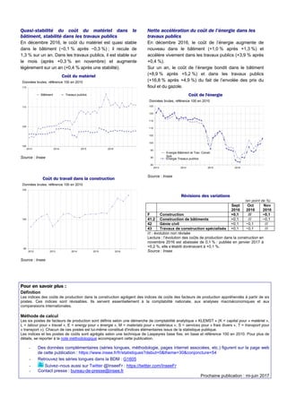 En décembre 2016, les coûts de production dans la construction ont augmenté de 0,3 %, après une période de quasi-stabilité, avec une hausse des coûts sur un an de 1,8 %. Le génie civil a connu une augmentation plus significative (+3,0 %) par rapport à la construction de bâtiments (+1,6 %). Les coûts des matériaux, de l'énergie, et du travail présentent des variations notables, notamment une forte hausse des coûts de l'énergie dans le bâtiment et les travaux publics.