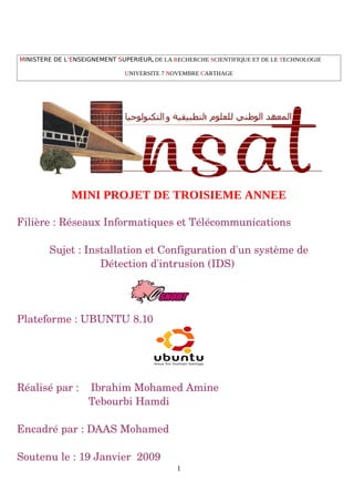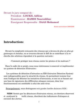 Le document présente un projet de troisième année sur l'installation et la configuration d'un système de détection d'intrusion (IDS) sur une plateforme Ubuntu 8.10, en se concentrant sur le logiciel open source Snort. Il décrit les différentes familles d'IDS, leur fonctionnement, ainsi que l'importance de la capture et de l'analyse du trafic réseau pour la sécurité. Enfin, le document détaille les étapes d'installation de Snort et les différentes spécificités techniques liées à sa mise en œuvre.