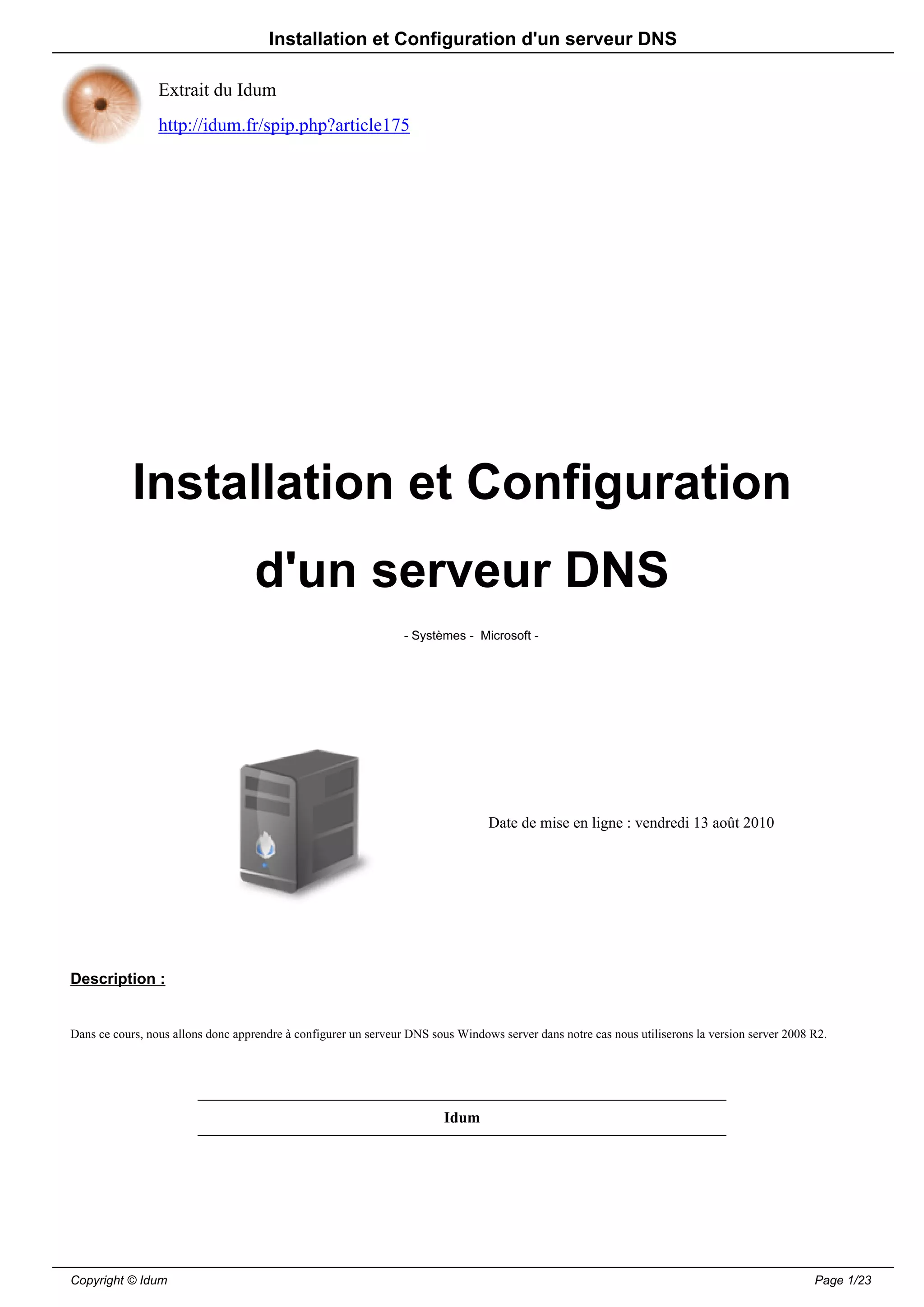Ce document fournit un guide étape par étape pour l'installation et la configuration d'un serveur DNS sous Windows Server 2008 R2. Il aborde des aspects essentiels tels que la configuration de l'adresse IP, l'ajout de machines, et le test de la résolution DNS. Le document se conclut par des recommandations pour les configurations IP des stations de travail.