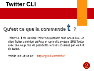 Le document présente twitter-cli, un client Twitter pour la console sous GNU/Linux, écrit en Ruby. Il fournit des instructions détaillées sur l'installation et la configuration de l'application, y compris la création d'une application Twitter pour obtenir une clé API. Enfin, il confirme le succès de l'installation et de la configuration après l'autorisation d'accès au compte Twitter.