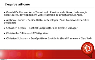Le document présente des pratiques et outils utilisés par l'équipe de test chez athome.lu, comprenant des tests unitaires, tests fonctionnels, et intégration continue. Il souligne l'importance de l'automatisation dans le processus de test à l'aide de frameworks tels que PHPUnit et Behat, ainsi que l'utilisation de Jenkins pour la gestion des builds. Les principes de Scrum et Agile sont également abordés, mettant l'accent sur la planification des sprints et la gestion des versions.