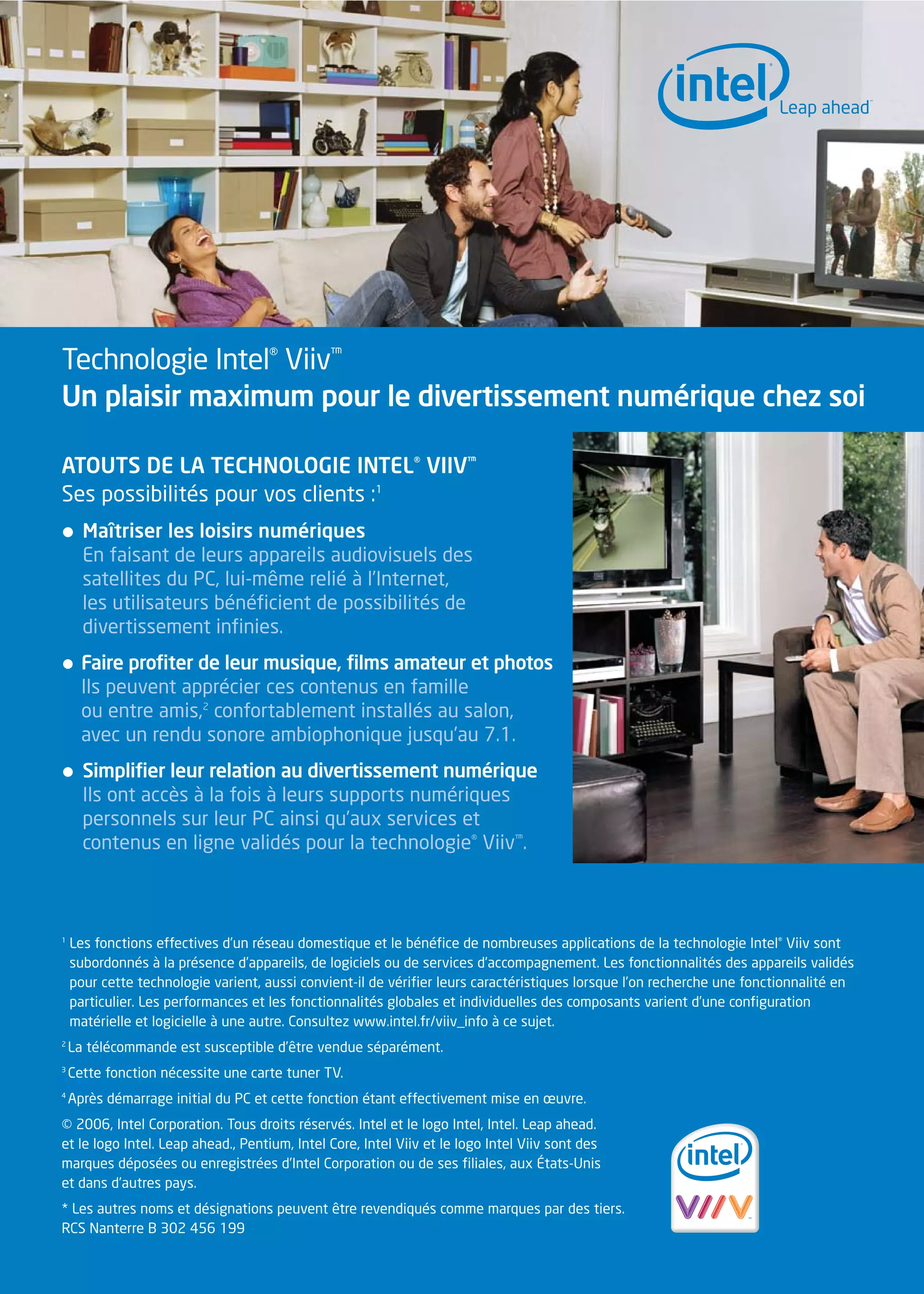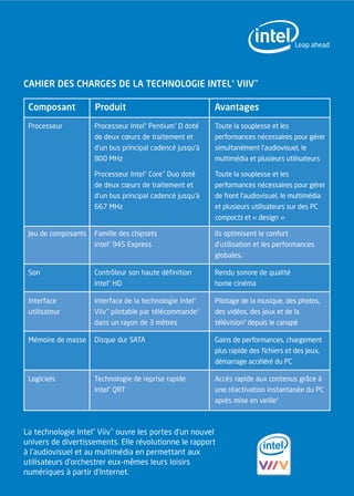 La technologie Intel® Viiv™ permet aux utilisateurs de contrôler leurs loisirs numériques, transformant leurs appareils audiovisuels en extensions de leur PC connecté à Internet. Elle offre un accès à une multitude de contenus, tels que musique et films, tout en garantissant une expérience audio de haute qualité. Les performances dépendent des configurations matérielles et logicielles, nécessitant des appareils compatibles pour profiter pleinement des fonctionnalités offertes.