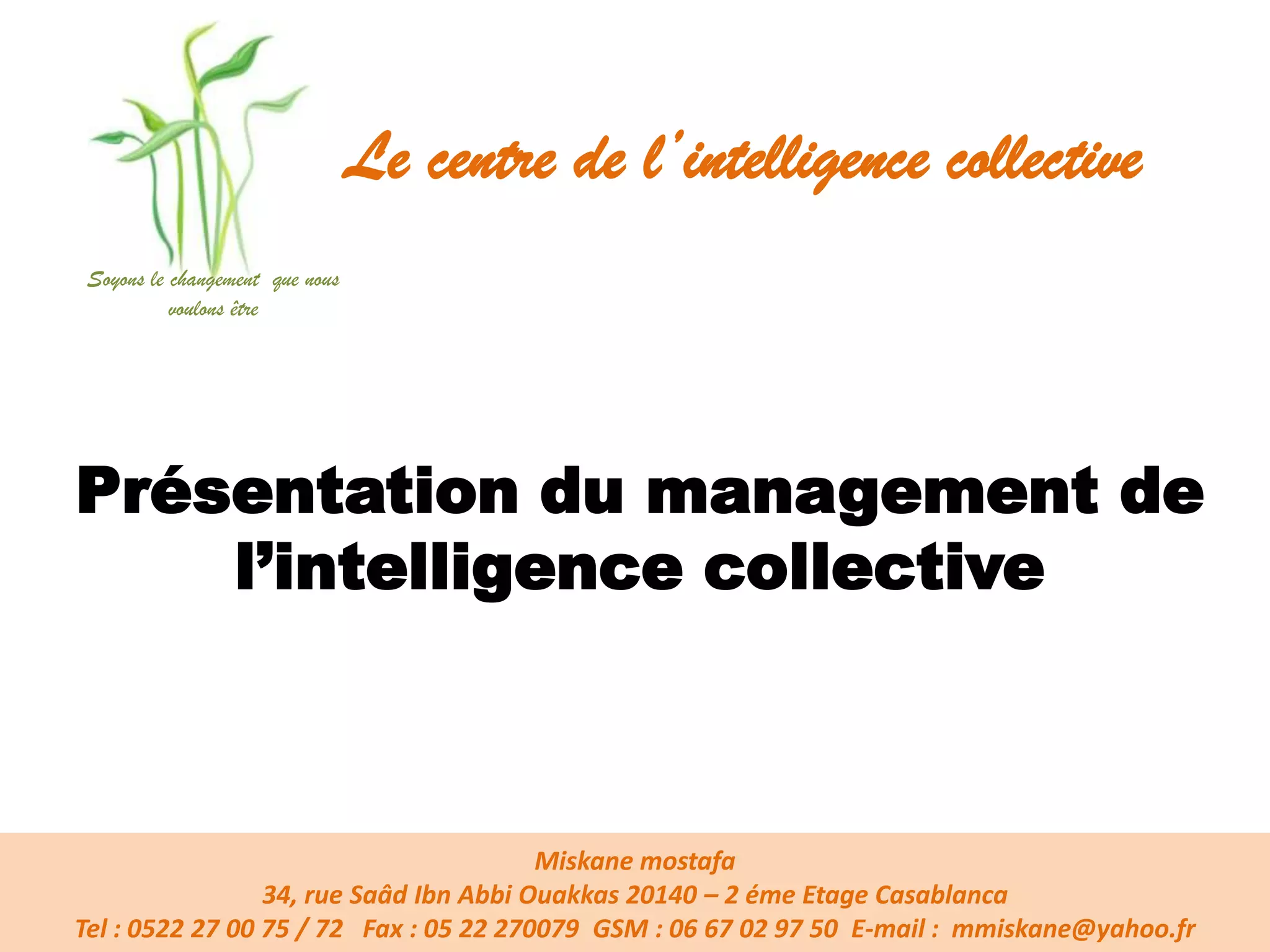 Le document présente le concept de management de l'intelligence collective comme une solution pour les défis auxquels les entreprises font face dans un environnement de stress et d'urgence. Il souligne l'importance de la coopération et de l'implication de tous les employés pour améliorer la performance collective et atteindre les objectifs de l'entreprise. Enfin, il propose un cursus de formation pour développer les compétences nécessaires à l'instauration de ce type de management au sein des organisations.