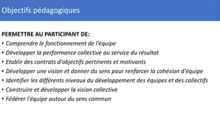 Ce document présente un programme de formation sur le développement de l'intelligence collective au sein des équipes, mettant l'accent sur la communication, la coopération et la création d'une vision partagée. Il aborde les défis et les stratégies pour surmonter les résistances et favoriser un environnement propice à la collaboration. L'objectif principal est d'améliorer la performance collective par le biais de l'engagement, de l'empathie et de la créativité des membres de l'équipe.