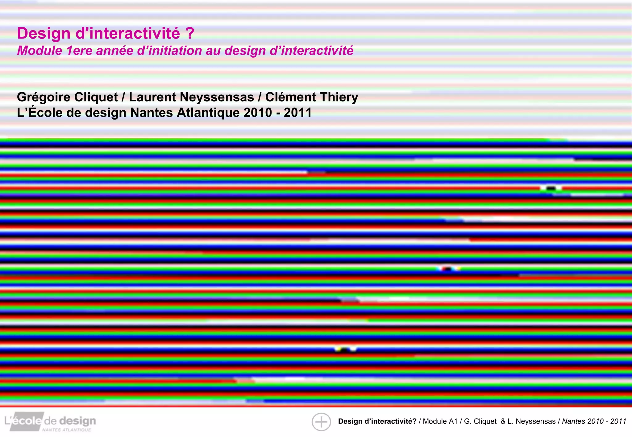 Le document présente un module d'initiation au design d'interactivité, abordant les concepts de design, interactivité et leurs applications. Il détaille la production de contenus numériques, la réalisation d'interfaces et la conception de services innovants, en soulignant l'importance de l'expérience utilisateur. La formation mentionne également les outils et méthodes pour le design et les nouvelles modalités d'interaction, telles que l'informatique omniprésente.