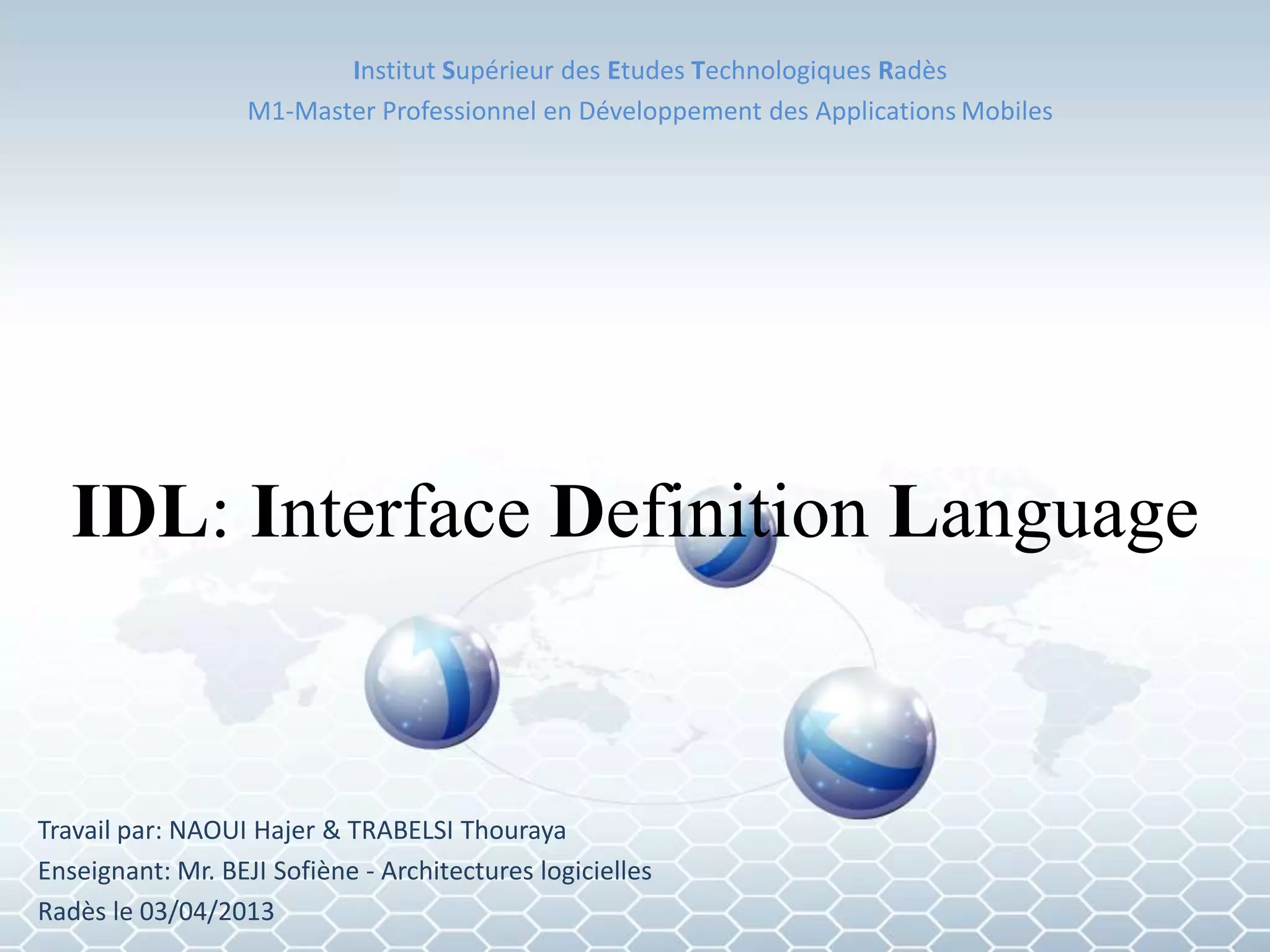 Le document présente le langage de définition d'interface (IDL) et ses caractéristiques, avantages, et fonctionnement, notamment à travers un exemple d'application bancaire. Il souligne l'importance de l'IDL dans les systèmes distribués, en facilitant la communication entre applications en réduisant le besoin de gérer les détails de communication. Enfin, il évoque l'avenir de l'IDL et son rôle dans les applications de plus en plus interconnectées.