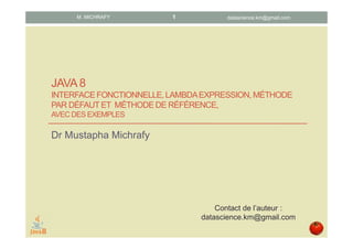 Ce document présente les interfaces fonctionnelles introduites par Java 8, incluant les méthodes par défaut, les lambda expressions et les références de méthode. L'étude aborde leurs rôles dans la programmation fonctionnelle, ainsi que leur utilisation pour rendre le code plus concis et lisible. Des exemples illustrent l'application de ces concepts et la création d'interfaces fonctionnelles à l'aide de lambda expressions.