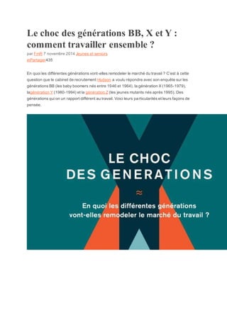 Les jeunes de moins de 26 ans et les seniors de plus de 45 ans rencontrent des difficultés d'accès au marché du travail en France en raison de la crise et des préjugés liés à l'âge. Les différentes générations, allant des baby-boomers à la génération Z, ont des valeurs et des compétences variées qui modifient le paysage professionnel. La coopération intergénérationnelle devient essentielle pour le fonctionnement des entreprises et nécessite des adaptations dans les méthodes de management.