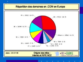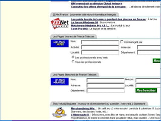 Ce document présente l'histoire et les différentes fonctionnalités d'Internet, en soulignant l'évolution de services tels que le courrier électronique, le transfert de fichiers et les forums de discussion. Il aborde également le fonctionnement des protocoles TCP/IP, le système de nommage des machines, ainsi que les outils de navigation et les moteurs de recherche. Enfin, il discute de l'essor d'Internet et des futures tendances dans les services en ligne.