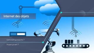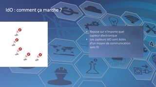 Le document décrit le fonctionnement et les applications de l'Internet des objets (IoT), soulignant l'utilisation de capteurs électroniques connectés via des communications sans fil à Internet. Divers cas d'utilisation sont abordés, notamment la gestion des foules, la sécurité des lieux de travail, et la maintenance préventive, illustrant la polyvalence des capteurs dans divers secteurs. En outre, il met en avant l'importance de ces technologies pour améliorer l'efficacité opérationnelle et la sécurité dans différents environnements.