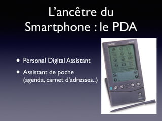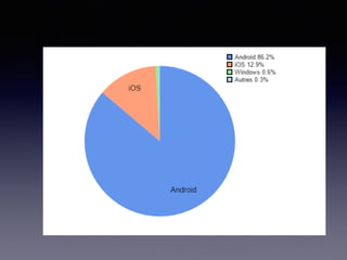 Le document présente l'évolution des smartphones et des technologies mobiles, en soulignant l'impact de l'iPhone en 2007 et l'émergence d'Android. Il aborde également l'historique de Microsoft et BlackBerry, ainsi que les tendances actuelles vers des appareils multiples comme les tablettes et les montres connectées. Enfin, il met en évidence les défis technologiques tels que la fragmentation des systèmes et l'importance croissante des applications web progressives.
