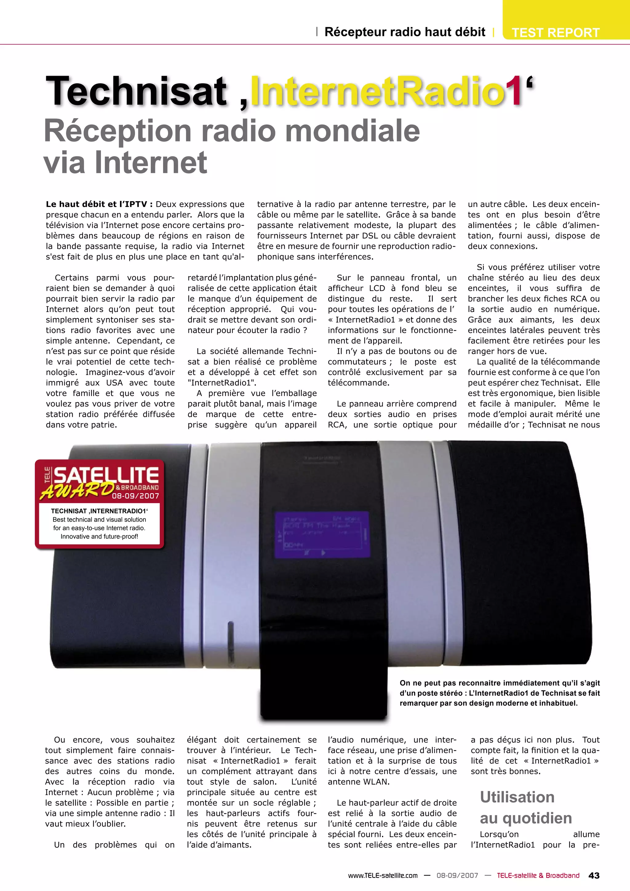 Le rapport teste le récepteur radio haut débit Technisat 'internetradio1', qui permet d'accéder à des stations de radio du monde entier via Internet. L'appareil se distingue par sa conception moderne, sa facilité d'utilisation et sa qualité audio supérieure, tout en nécessitant une configuration initiale simple. Avec la possibilité de mémoriser des stations favorites et d'accéder à une vaste bibliothèque de canaux, il est présenté comme une solution innovante pour les amateurs de radio numérique.