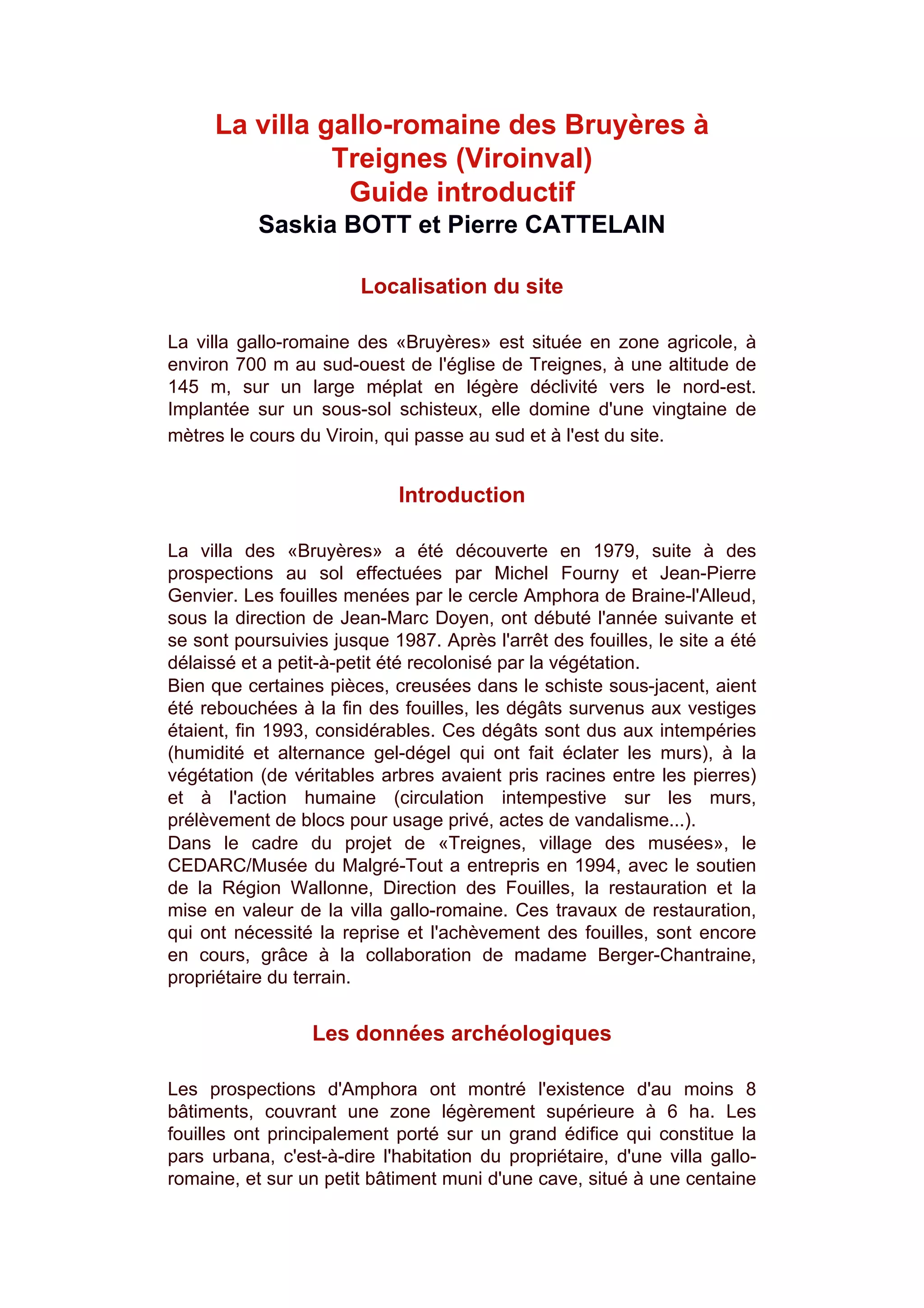 La villa gallo-romaine des Bruyères à Treignes, découverte en 1979, a été fouillée jusqu'en 1987, révélant des bâtiments et objets liés à des activités métallurgiques et domestiques. La restauration du site, entamée en 1994 sous l'égide du musée local, vise à préserver les vestiges significatifs tels que les systèmes de chauffage et les installations de bains. Les fouilles ont fourni des datations et des éléments architecturaux, indiquant plusieurs phases d'occupation et d'aménagement entre le Ier et le IIIe siècle de notre ère.