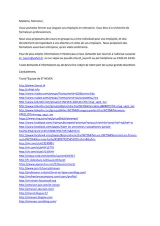 Nous proposons des formations linguistiques pour vos employés, en groupe ou individuelles, correspondant à vos attentes. Les cours peuvent se faire en présentiel ou en vidéo conférence. Pour plus d'informations, contactez-nous par courriel, Skype ou téléphone.