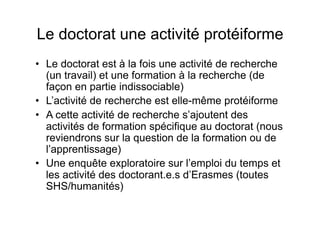 Le document explore la complexité et la diversité des activités liées au doctorat, combinant recherche, formation et tâches administratives. Il présente les résultats d'une enquête sur l'emploi du temps des doctorants, soulignant des rapports variés au temps et l'importance d'une gestion efficace du temps. Les participants expriment des défis dans leur investissement temporel, conduisant à la nécessité d'objectifs clairs et d'une structure de travail.