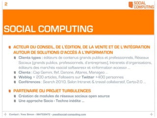 Yves Simon, fondateur d'Amoweba et responsable chez Hémisphère, est un expert en social computing, un domaine qui combine l'interaction sociale et la gestion de données dans des environnements numériques. Le document décrit les tendances et prévisions pour 2010, mettant en avant l'importance croissante des médias sociaux et du marketing transmedia. Simon souligne également l'évolution vers un web plus intégré et interactif, ainsi que l'impact des technologies sur les relations sociales et professionnelles.