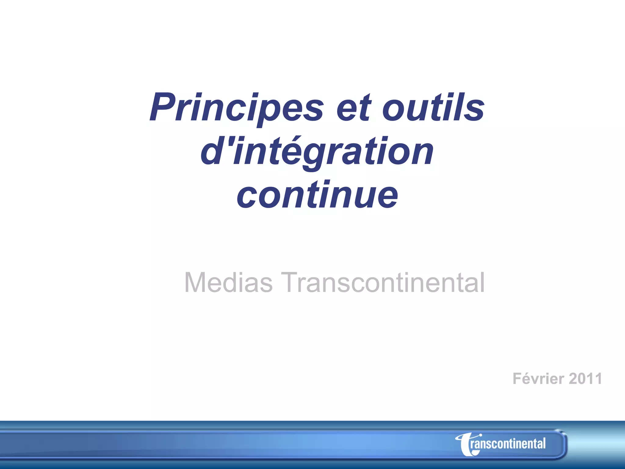 La présentation aborde les principes et outils de l'intégration continue utilisés au sein de Transcontinental Médias, mettant en avant l'importance de l'intégration fréquente du code, des tests automatisés et des outils tels que Maven, Hudson et Sonar. L'intégration continue améliore la collaboration, la détection des erreurs et la productivité, tout en nécessitant un changement de paradigme de la part des développeurs et gestionnaires. Les bénéfices incluent une meilleure intégration système, une réduction des risques et une agilité accrue dans le processus de développement logiciel.