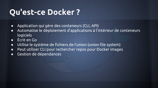 Docker est une application qui automatise le déploiement et la gestion des conteneurs logiciels, offrant une exécution rapide et une faible consommation de ressources. Il permet de créer et de gérer des images et des conteneurs facilement, surtout dans les environnements de SaaS et PaaS. Le document fournit également des exemples de commandes Docker et des références à des ressources utiles pour approfondir le sujet.