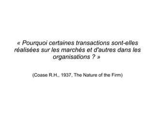 Le document discute des raisons pour lesquelles certaines transactions se déroulent sur les marchés, tandis que d'autres se réalisent au sein des organisations, en s'appuyant sur les travaux de Coase et Simon sur les coûts de transaction et l'incertitude. Il met en lumière l'importance des relations à long terme dans les entreprises et la nécessité de gérer l'incertitude, tout en abordant les limites et l'opportunisme dans la théorie des contrats. Enfin, il souligne les interactions entre les membres d'une équipe et l'autorité dans un cadre contractuel, tout en établissant des parallèles entre les marchés et les structures organisationnelles.