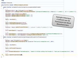 Le document fournit une introduction approfondie aux tests unitaires, définissant leur importance et les pratiques recommandées pour assurer un fonctionnement correct des unités de code. Il aborde les outils et techniques tels que les bouchons pour simuler des environnements, ainsi que les principes du développement piloté par les tests (TDD). Enfin, il souligne la nécessité d'intégrer les tests unitaires dans le processus de développement pour garantir la qualité du logiciel.