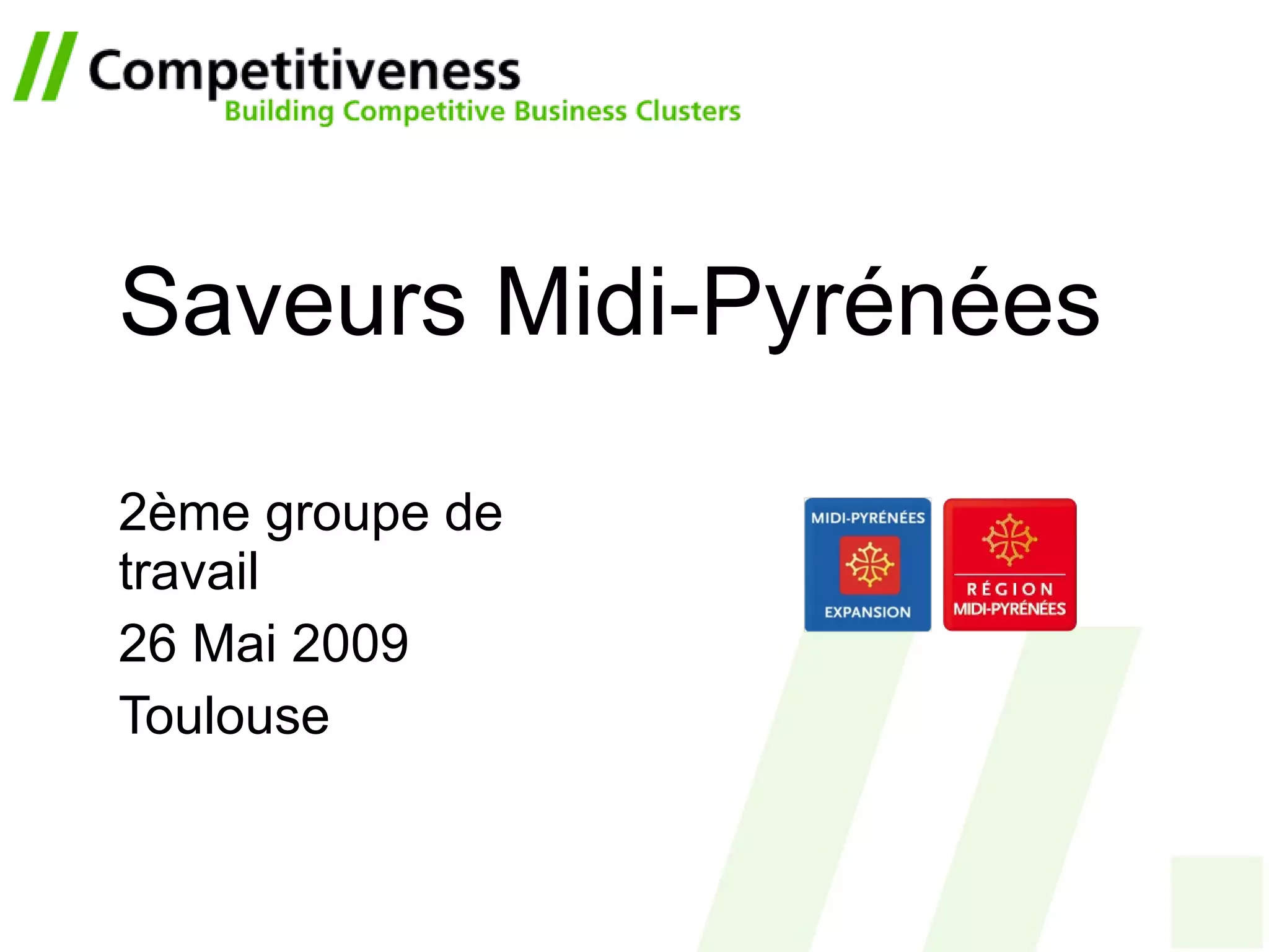 La réunion du groupe de travail pour l'initiative Saveurs Midi-Pyrénées a eu lieu le 26 mai 2009, avec des discussions sur le calendrier, les objectifs, et des plans d'action concernant la logistique, les produits et les technologies de production. Les défis du cluster incluent l'évolution de la consommation alimentaire, notamment l'influence croissante des femmes sur le marché du travail, et la nécessité d'adapter les produits gourmets aux changements de préférences des consommateurs. La région se concentre sur l'amélioration de la qualité des produits tout en répondant efficacement aux nouvelles attentes des consommateurs.