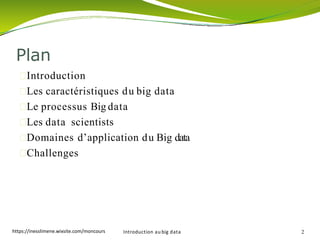 Le document présente une introduction au big data, en expliquant ses caractéristiques, son processus et ses applications dans divers domaines tels que le marketing, la politique, et l'administration publique. Il souligne l'importance croissante des données et des data scientists, ainsi que les défis associés à la gestion de ces grandes quantités de données. De plus, il aborde les implications des big data sur la sécurité et les compétences requises pour les exploiter efficacement.
