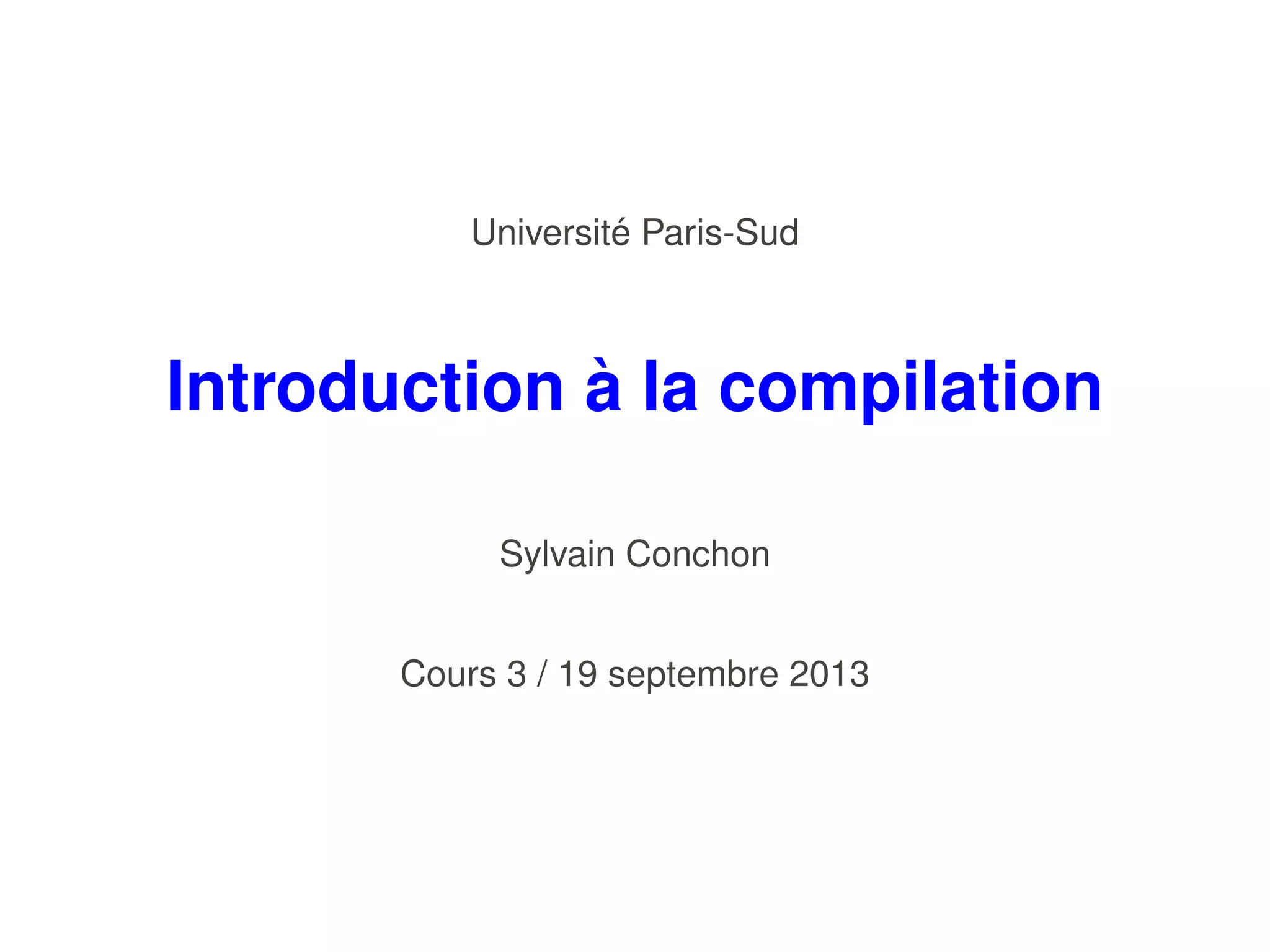 Ce document traite de l'introduction à la compilation, en se concentrant sur la syntaxe abstraite et l'analyse syntaxique. Il décrit le processus d'analyse lexicale, les structures de grammaire, et présente des concepts comme les arbres de dérivation et les grammaires ambigües. Enfin, des méthodes pour construire des analyseurs descendants sont abordées, ainsi que les notions de null, first et follow pour l'analyse syntaxique.