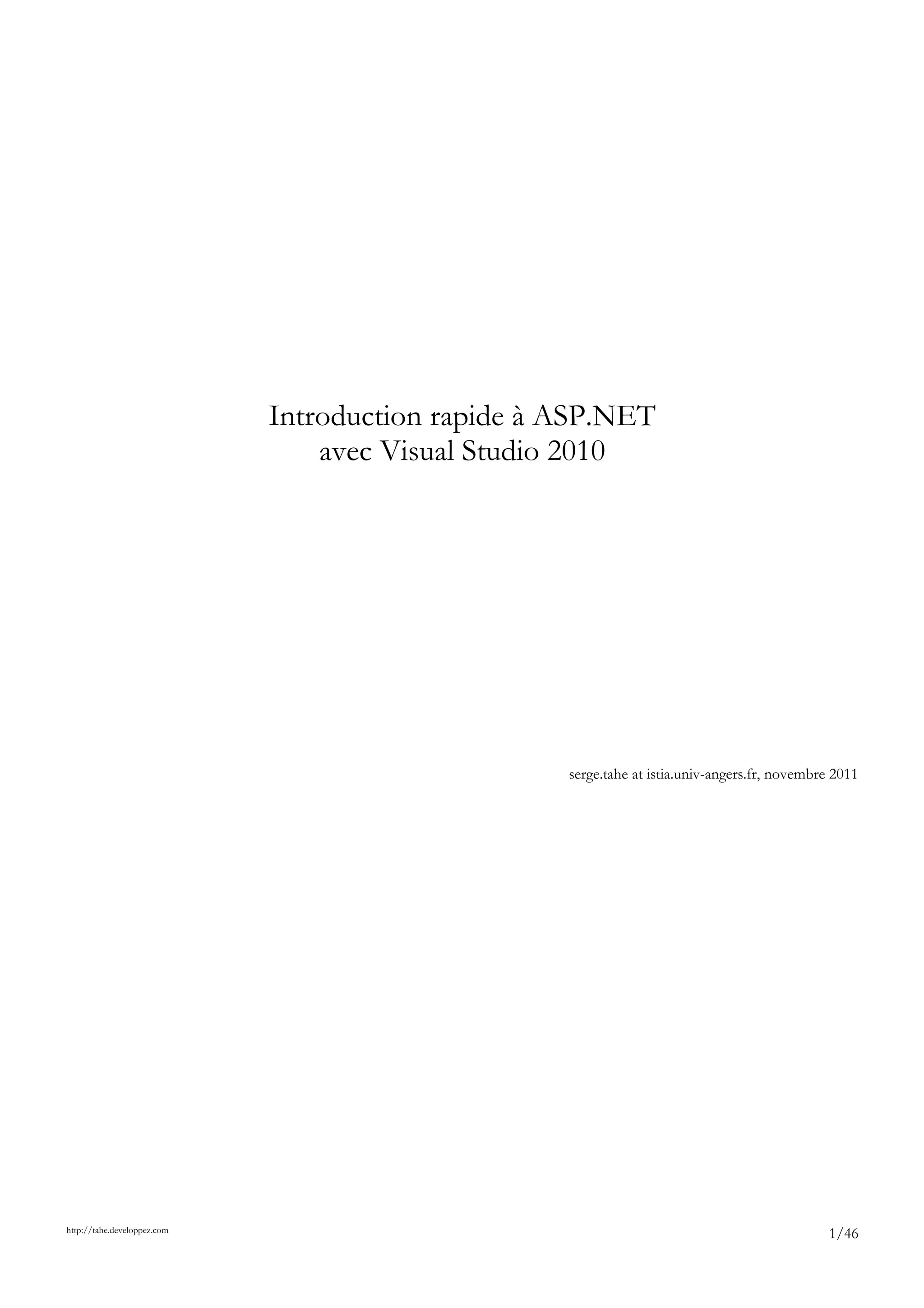 Ce document introduit les concepts fondamentaux d'ASP.NET en utilisant Visual Studio 2010, fournissant des exemples pratiques pour créer des applications web. Il explique la création d'un projet, la structure des fichiers, et la gestion des événements dans une page web ASP.NET. Des liens vers des ressources supplémentaires sont fournis pour approfondir les sujets abordés.