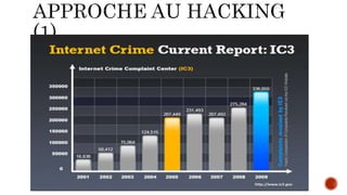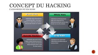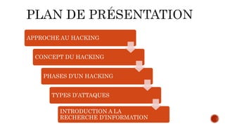 Le document aborde le concept du hacking, détaillant ses phases, types d'attaques et techniques comme le social engineering et le phishing. Il propose également des outils de recherche pour découvrir des informations et des cours de hacking en ligne. Enfin, il mentionne une discussion sur la nécessité de se renseigner sur une personne avant de conclure une affaire importante.