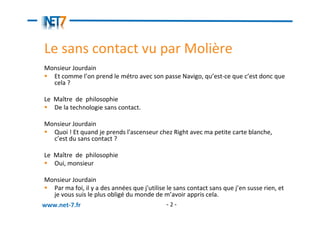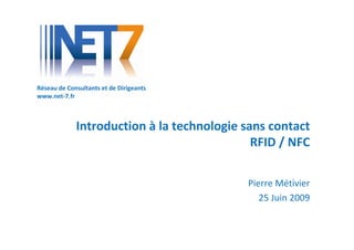 Le document présente une introduction à la technologie sans contact, notamment le RFID et le NFC, en expliquant leur fonctionnement et leurs applications dans divers secteurs tels que la logistique, le transport et la sécurité. Il aborde également les défis et les opportunités associés à ces technologies, ainsi que l'écosystème des acteurs impliqués dans leur développement. Enfin, il met en avant l'importance croissante de ces technologies dans la vie quotidienne et leurs futurs potentiels.