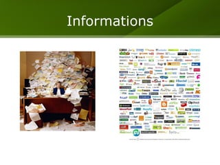 Le document traite des communautés et collaborations au sein du Web 2.0, en mettant l'accent sur le partage d'informations et l'usage des outils de collaboration comme les RSS et les blogs. Il souligne l'importance de la conversation entre les utilisateurs et les entreprises afin de définir des objectifs clairs et mesurables. Enfin, il renvoie à des ressources supplémentaires pour approfondir ces sujets.