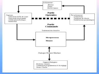 Le document traite des automatismes industriels, spécifiquement des automates programmables, en expliquant leur définition, leur architecture et leur fonctionnement. Il détaille les composants d'un système automatisé, tels que les actionneurs, capteurs et préactionneurs, ainsi que les applications industrielles de ces technologies. L'évolution historique des automates et les fabricants clés du secteur sont également mentionnés.