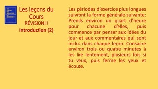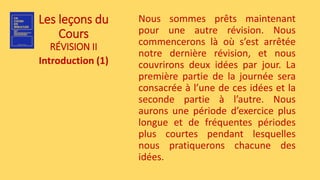 Le document présente un plan de révision où deux idées seront abordées chaque jour. Il met l'accent sur l'importance de l'écoute attentive durant les périodes d'exercice et encourage à surmonter les distractions par la détermination. Les périodes d'exercice sont vues comme des consécrations à une vie de vérité et de salut.